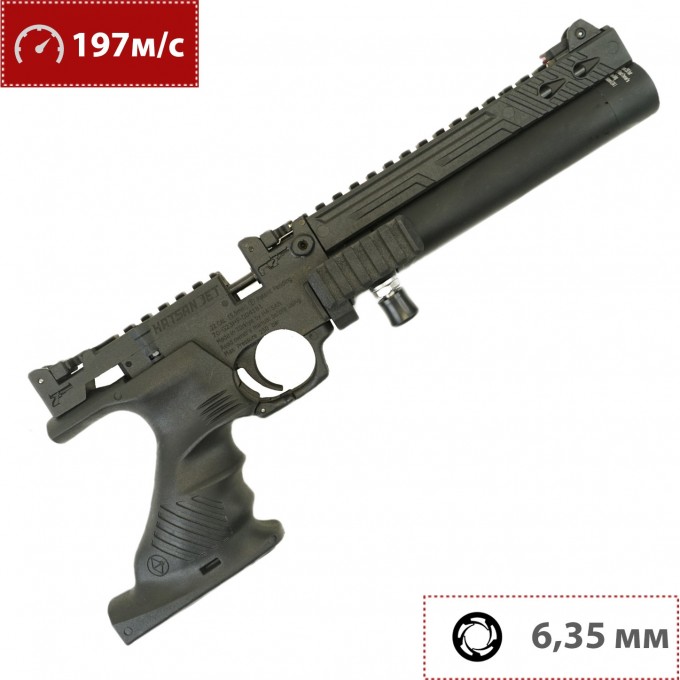 Пневматический пистолет Jet 1 производства турецкой компании Hatsan - модель с боковым (с левой стороны) типом заряжания, с предварительной накачкой (РСР), в основном предназначенная для спортивной стрельбы. Ствол пистолета нарезной, в качестве боеприпасов используются свинцовые пули калибра 6,35 мм, магазин барабанного типа вмещает 7 пуль.